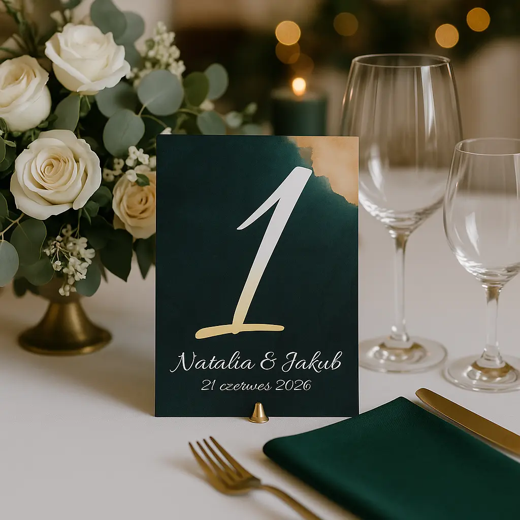 Elegancki numerek na stół w formacie A6 to stylowy dodatek, który doskonale uzupełni aranżację stołów na Twoim przyjęciu weselnym. Głęboki, szmaragdowy odcień tła w połączeniu ze złotym akcentem w rogu oraz delikatną, kaligraficzną czcionką tworzą wyjątkową, luksusową kompozycję. Duży, czytelny numer stołu sprawia, że goście z łatwością odnajdą swoje miejsce, a personalizowane imiona Pary Młodej i data uroczystości dodają całości indywidualnego charakteru.